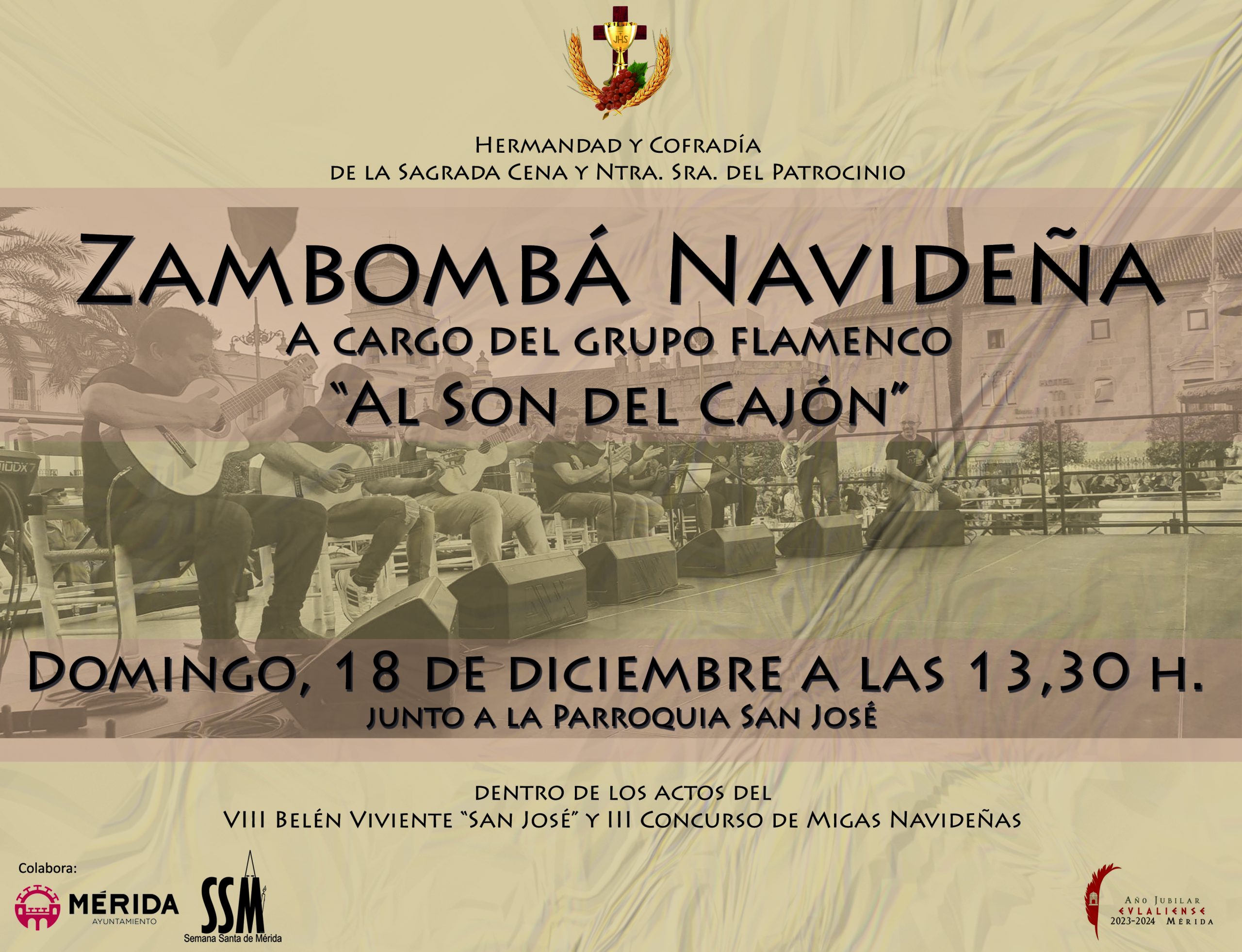 «Al Son del Cajón» ofrecerá una Zambombá Navideña con motivo del Belén Viviente «San José»por Sagrada Cenaen Noticias, Noticias 2022en Publicado el 14 de diciembre de 202214 de diciembre de 2022 Dentro de los actos del VIII Belén Viviente «San José» y III Concurso de Migas Navideñas, el grupo flamenco emeritense «Al Son del Cajón» ofrecerá una Zambombá Navideña.El acto comenzará aproximadamente a las 13.30 horas.