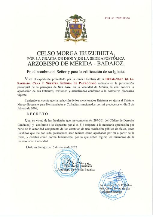 Con la aprobación de la actualización de los Estatutos de la Hermandad por parte del arzobispo de Mérida-Badajoz, se concede a la Hermandad el título de SACRAMENTAL pasando a ser: SACRAMENTAL Y PENITENCIAL HERMANDAD DE LA SAGRADA CENA Y NUESTRA SEÑORA DEL PATROCINIO.