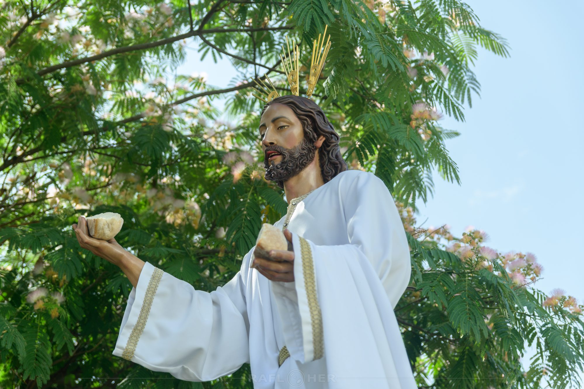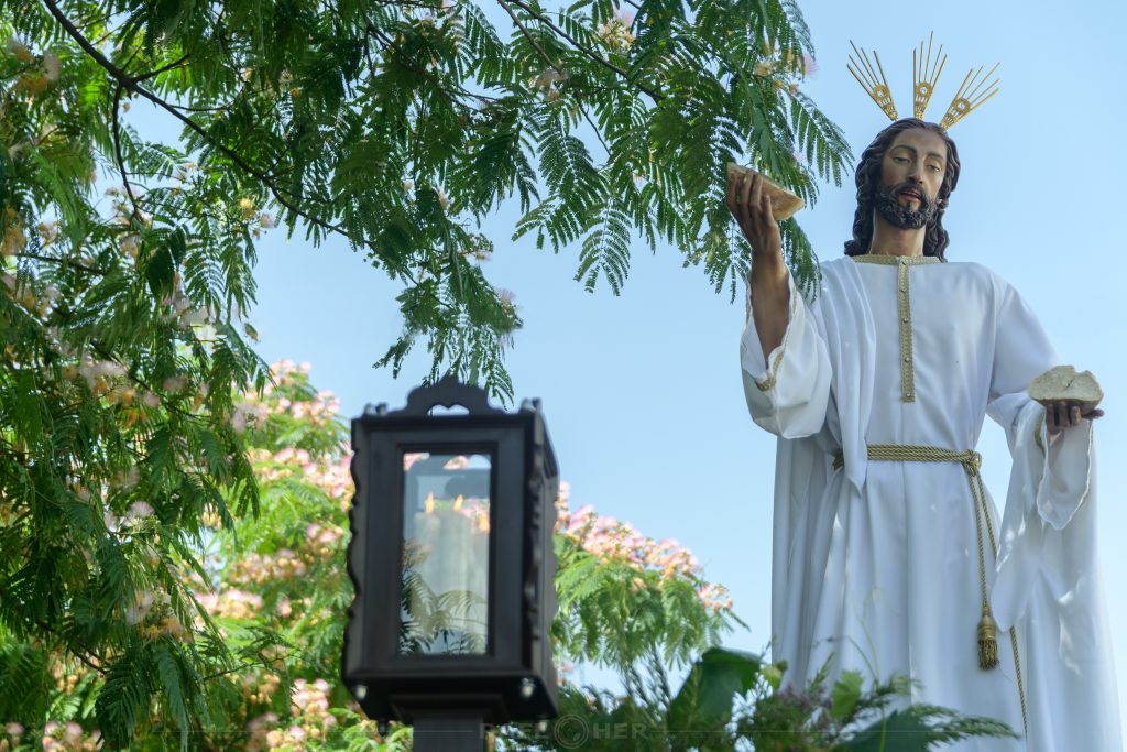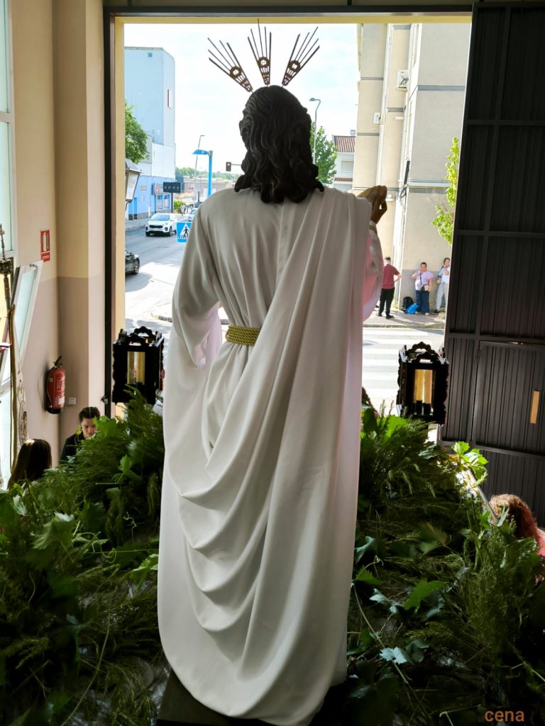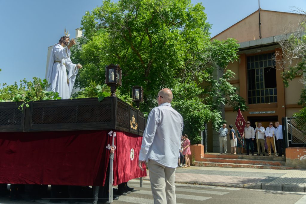 a las 10.30 horas, puntual como viene siendo habitual en los desfiles procesionales de la Cena, comienza la procesión con Jesús del Amor por las calles de la barriada de la parroquia. Se abren las puertas de la Hermandad en un día de luz y sol, que apunta a una jornada calurosa.