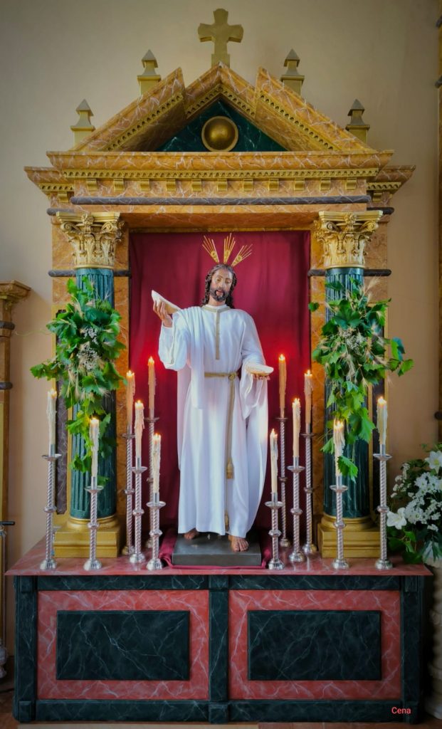 Para esta semana Eucarística, la parroquia se engalanaba y colocaba a su titular, Jesús del Amor, en el retablo central, a la derecha del Jesús presente en el sagrario, adornado con hojas de vid y espigas. Lucía la Imagen, con gran esplendor